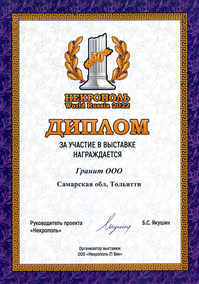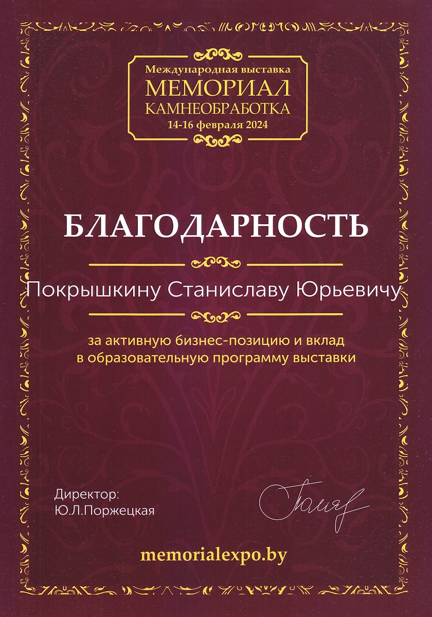 Ежегодные экспоненты профильных выставок в России «Некрополь», «Карелфорум», «Белый Тополь», «Ритуальные услуги. Камнеобработка» и в Белоруссии «Мемориал. Камнеобработка». Деятельность компании отмечена отраслевыми наградами: победители в номинации «медийность» в конкурсе «Золотая медаль Некрополь 2021», победители народного голосования на звание «Лучшая франшиза 2020», обладатели «Золотого скарпеля», номинанты на звание «Лицо Отрасли Некрополь 2020». Сотрудница компании признана «Самой обаятельной в каменной отрасли 2022».