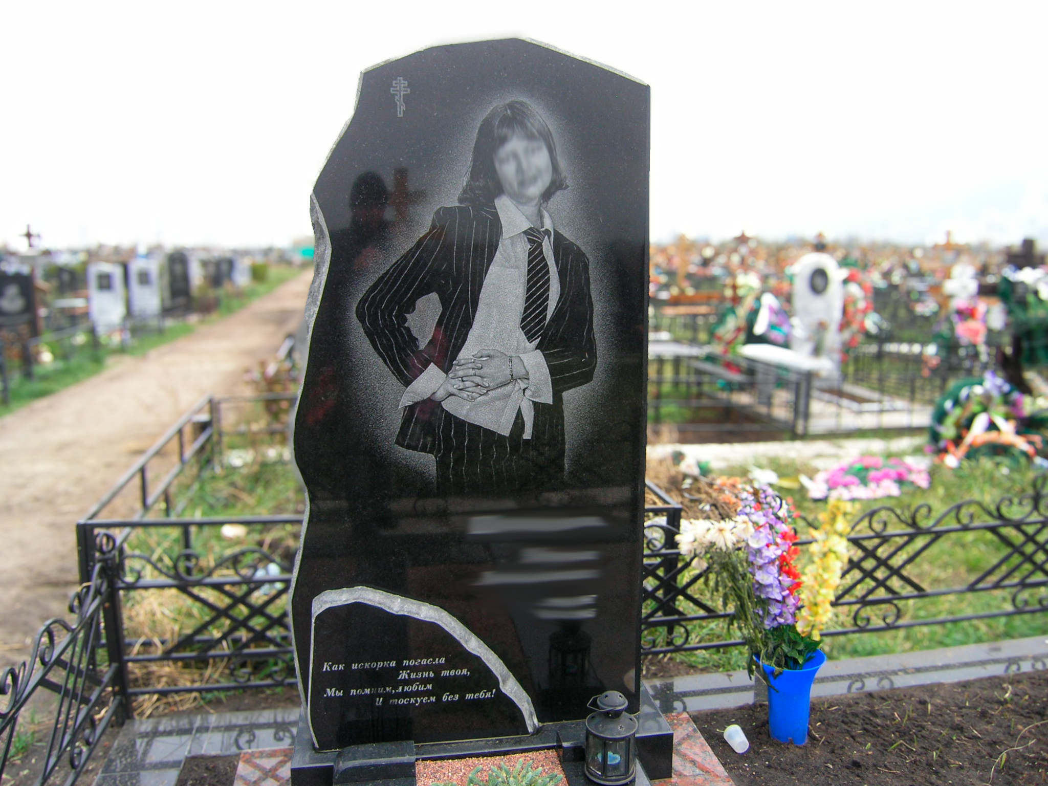 На черном граните портрет рисуется непосредственно на камне, а на мраморе и цветном граните портрет не гравируется, не будет видно черты лица. Нужно будет делать вставку или черной гранитной плитки или фотокерамики.